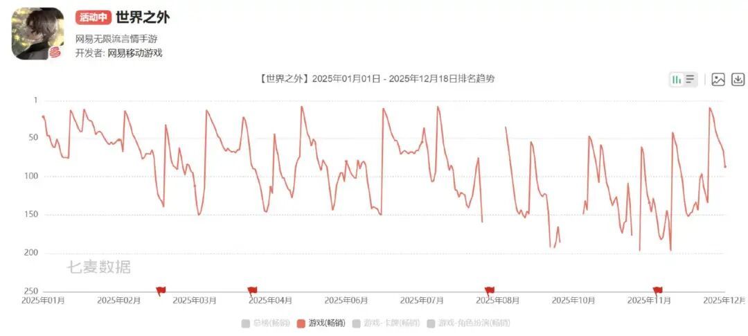 另外,网易《世界之外》排在榜单第9名,这是一款2024年上线的无限流言情游戏,其叙事特色得到了玩家的认可,但也因运营方式而曾引起一些争议,不过游戏近一年维持在iOS游戏畅销榜TOP100左右,流水约为2.14亿元。