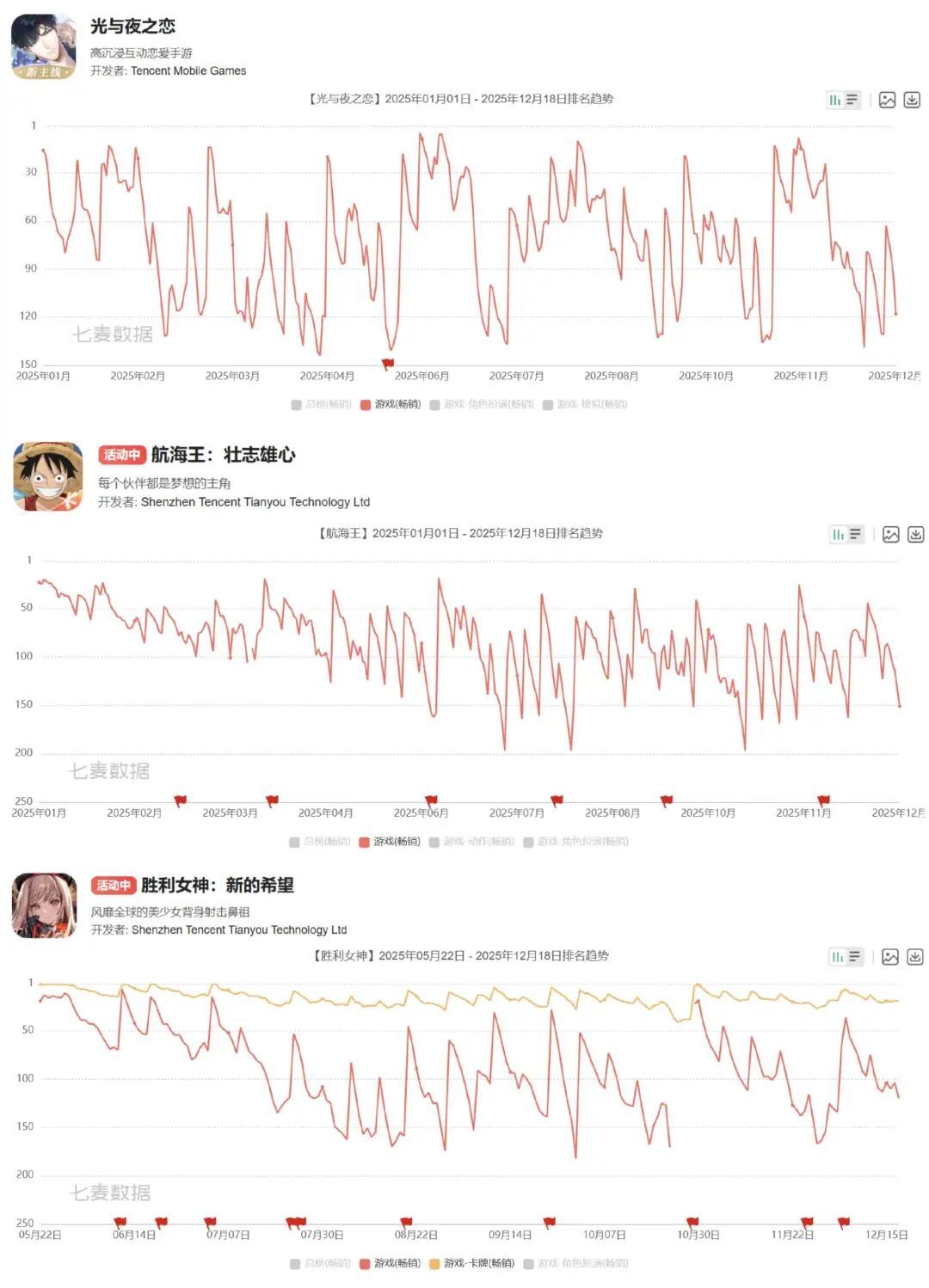 腾讯另外还有3款游戏流水同样破亿,即《光与夜之恋》《航海王:壮志雄心》《胜利女神:新的希望》。其中《光与夜之恋》排在榜单第6名,近一年维持在iOS游戏畅销榜TOP60左右,但趋势波动较大,流水约为2.85亿元;《航海王:壮志雄心》排在榜单第11名,近一年维持在iOS游戏畅销榜TOP100左右,流水约为1.51亿元。《胜利女神:新的希望》排在榜单第14,流水约为1.11亿元。需要指出的是,《航海王:壮志雄心》取得了不错的流水,但上线仅一年的时间,走势也有些波动,能否成为头部长青产品仍需要更长的观察期。