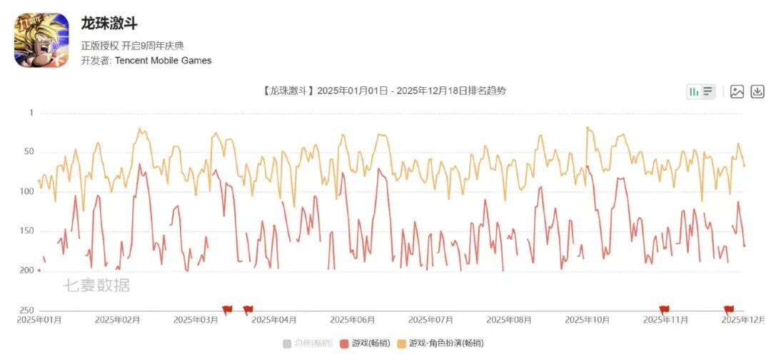 《龙珠激斗》位列榜单第30名,流水约为5505万元。这是一款在2016年上线的龙珠IP手游,由数字天空研发,腾讯负责发行。游戏运营超过9年,至今仍能维持在iOS游戏畅销榜TOP150左右,算得上是长青二游之一,走势也相当稳定。
