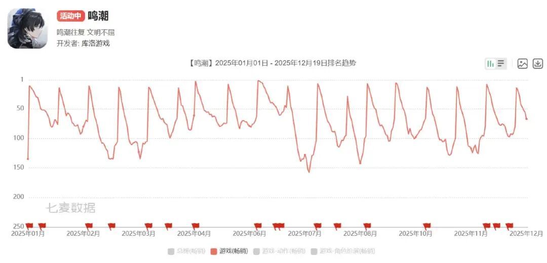 库洛游戏《鸣潮》排在榜单第5名,这款开放世界动作游戏在2024年5月份上线,游戏初上线时遭遇了舆情,但本身底子不差,团队调整速度也很快,整体情况也稳定下来。游戏近一年则维持在iOS游戏畅销榜TOP70左右,流水约为3.31亿元。在前不久举办的TGA中,《鸣潮》也成功战胜了《光与影:33号远征队》和《原神》拿到了玩家之声奖项。