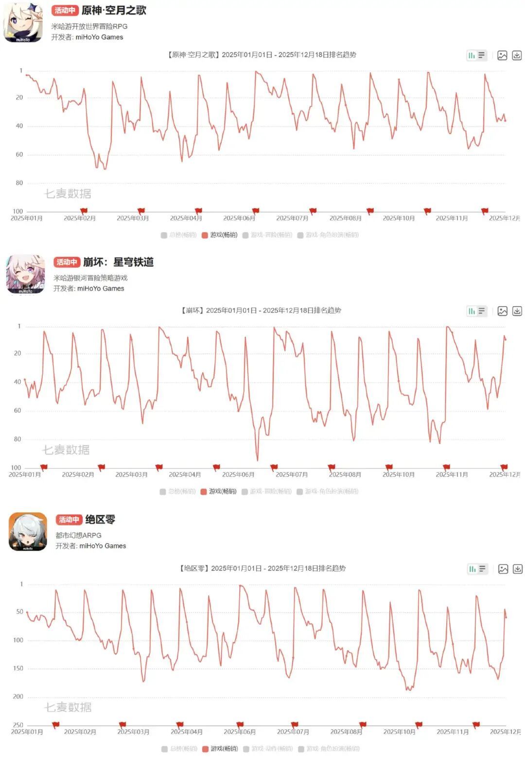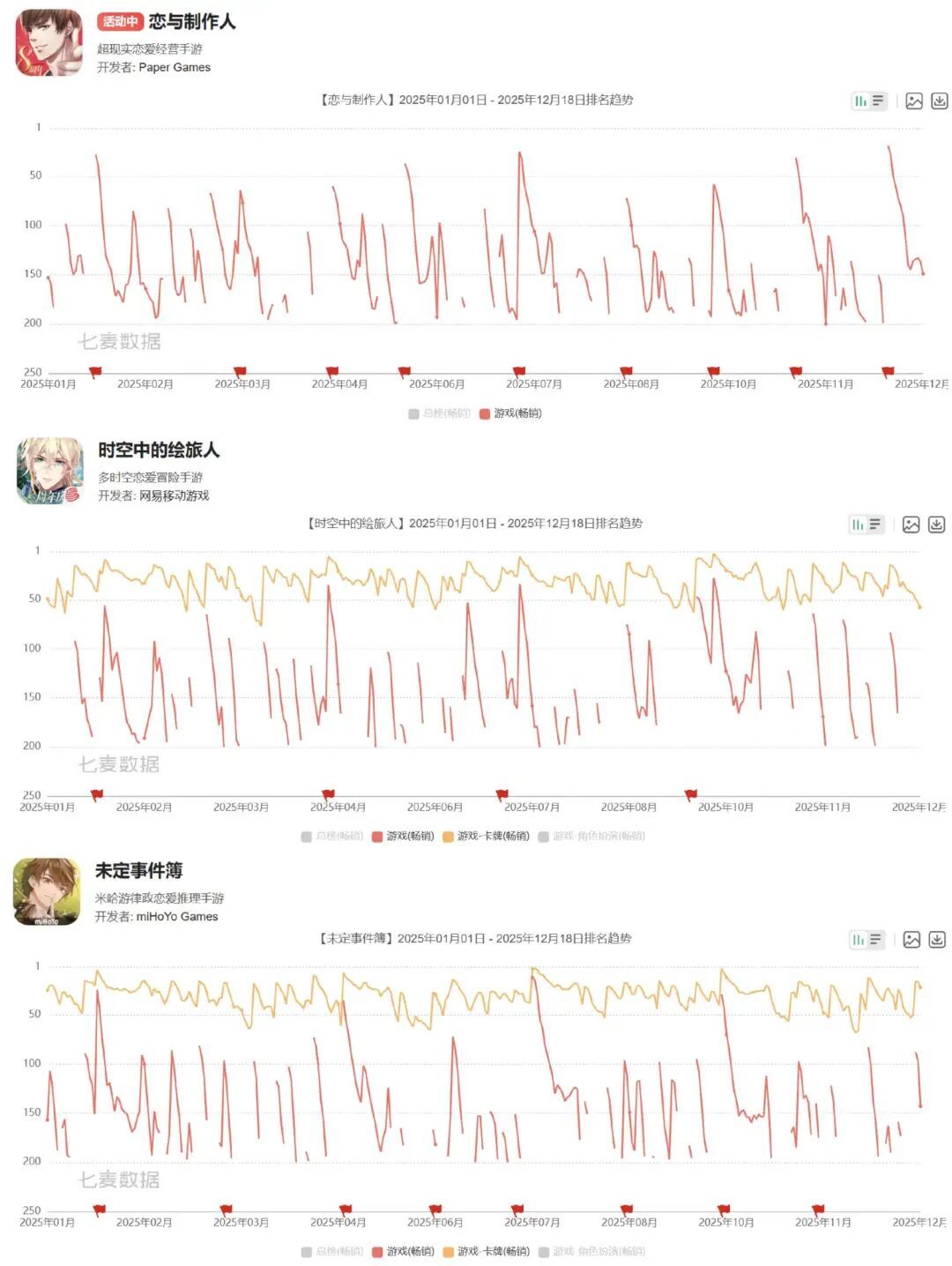 其中叠纸《恋与制作人》排在榜单第17名,近一年流水约为7755万元;网易《时空中的绘旅人》排在榜单第18名,近一年流水约为7376万元;米哈游《未定事件簿》排在榜单第20名,近一年流水约为6741万元。