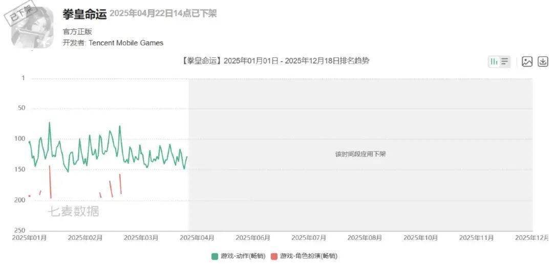 腾讯《拳皇命运》是一款拳皇IP的格斗手游,由银汉科技负责研发。这款游戏在2018年上线,取得了不错的成绩,首日拿下iOS免费榜第1名、iOS游戏畅销榜第5名的成绩,最高抵达过iOS游戏畅销榜第3名,后续在畅销榜TOP300之间待了将近4年时间。但2022年9月后,这款产品就掉出了畅销榜单,直至今年4月宣告停运。