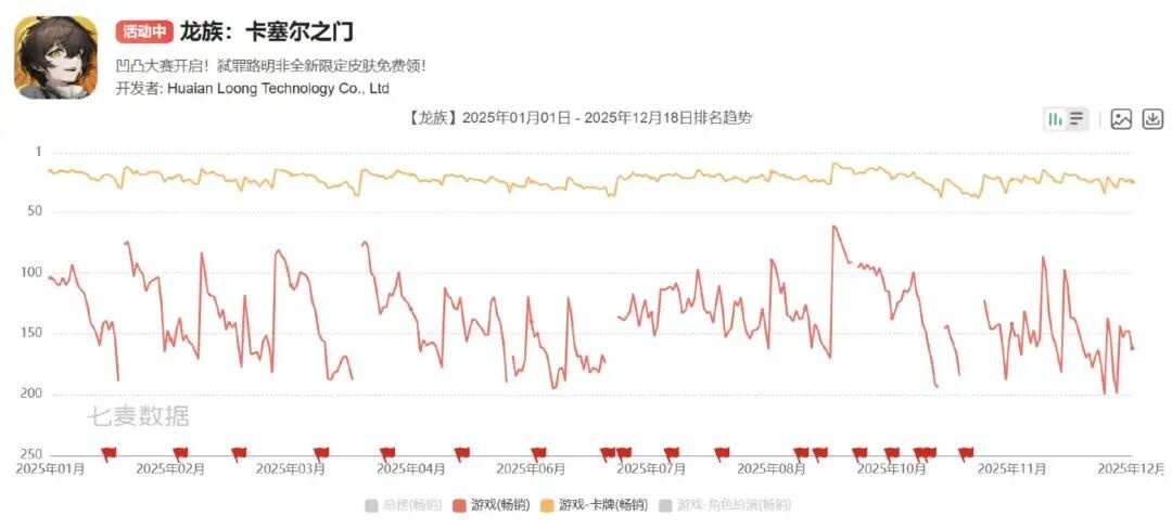 祖龙《龙族:卡塞尔之门》位列榜单第22名,这是一款龙族IP的卡牌手游,这款游戏在2024年9月份上线,曾一度闯入iOS游戏畅销榜第8名,后续没保持住势头有些下滑。游戏近一年走势维持在iOS游戏畅销榜TOP150左右,从卡牌分类畅销榜来看,其整体走势还算是稳定,流水约为6568万元。