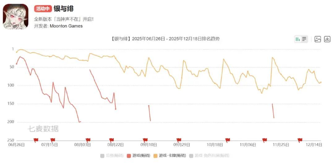 字节跳动《银与绯》是一款暗黑哥特风格的幻想RPG游戏,这款游戏选用了夜族题材,并尝试以番剧式剧情体验来做出差异化,在玩法上也进行了一些取舍,算得上是一款有特色的产品。但游戏在国内上线后没有取得太好的成绩,最高曾到达iOS游戏畅销榜第21名,后续下滑较快,不到两月就已基本掉出了畅销榜单,但从卡牌分类畅销榜来看,项目走势其实还算稳定,但流水峰值似乎不算太高。