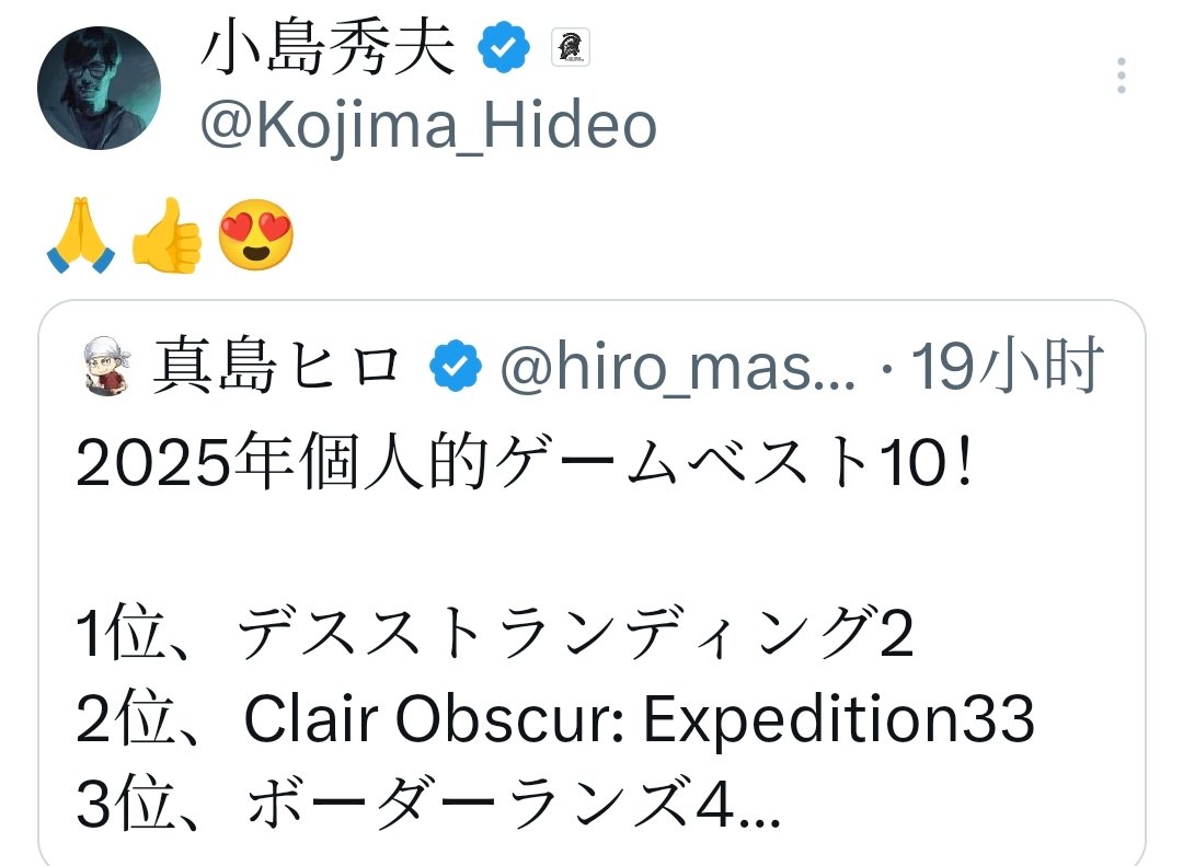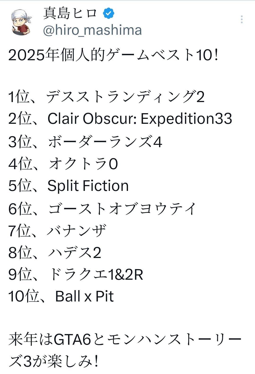 2025年12月29日,知名漫画家真岛浩在X上分享了自己2025年个人游戏TOP10榜单,以小岛秀夫工作室的《死亡搁浅2》荣登榜首,引发游戏圈和漫画粉丝的热议。