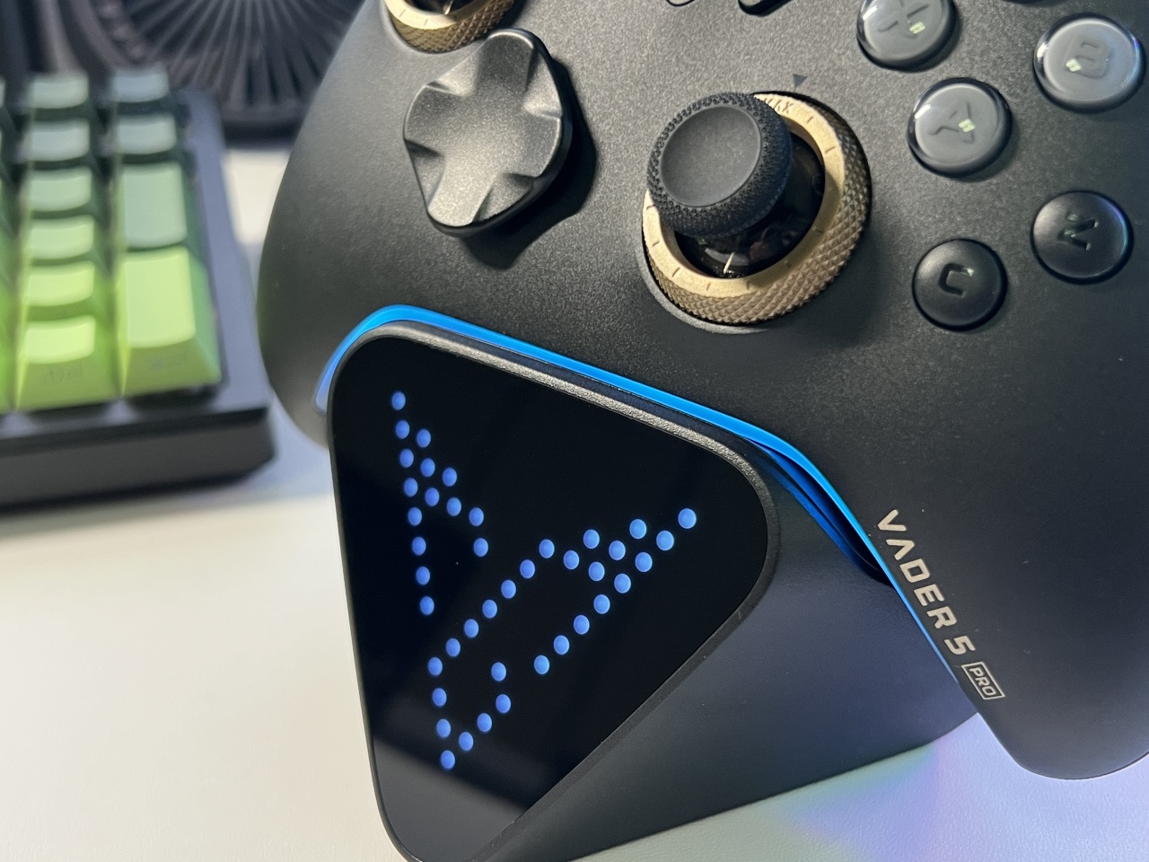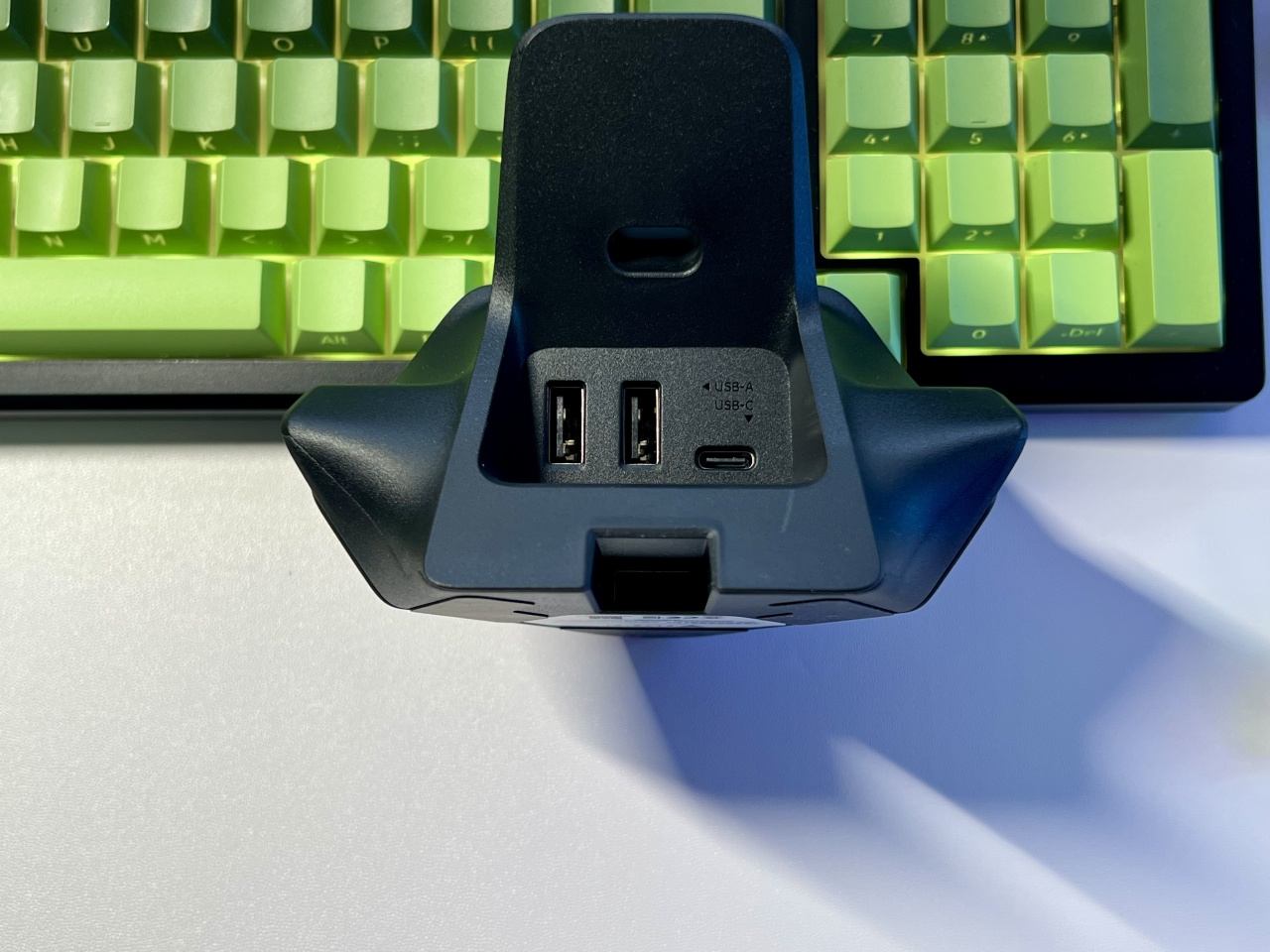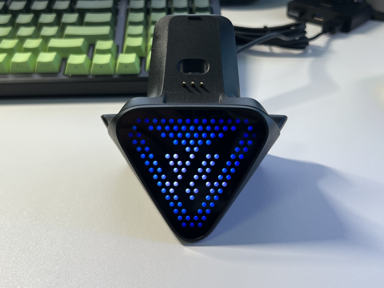 黑武士5Pro的充电底座2Pro,也是一个集成HUB功能的充电底座,整个底座的造型挺独特的,体积也挺大,手柄放置上去之后高度较高,正面是一个非常大的三角彩色点阵屏,默认显示飞智的标志,点阵屏有1680万色RGB灯效可调,可以去飞智空间站中DIY显示图案,充电底座给到了3个USB-A的拓展口(底部槽里有一个),可以放置接收器或者是拓展其他的A口设备。