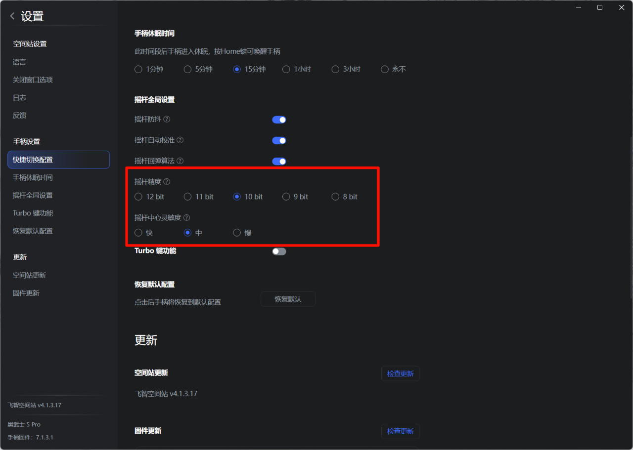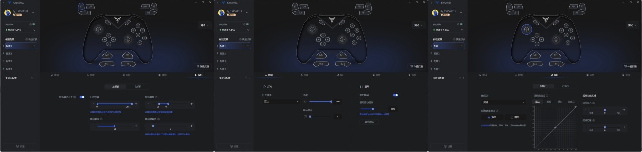 飞智空间站,默认手柄可以板载4个配置,调节灯光、改键、调节摇杆参数、开启体感和调节扳机参数,有个功能好玩,飞智空间站还能调节摇杆的精度。