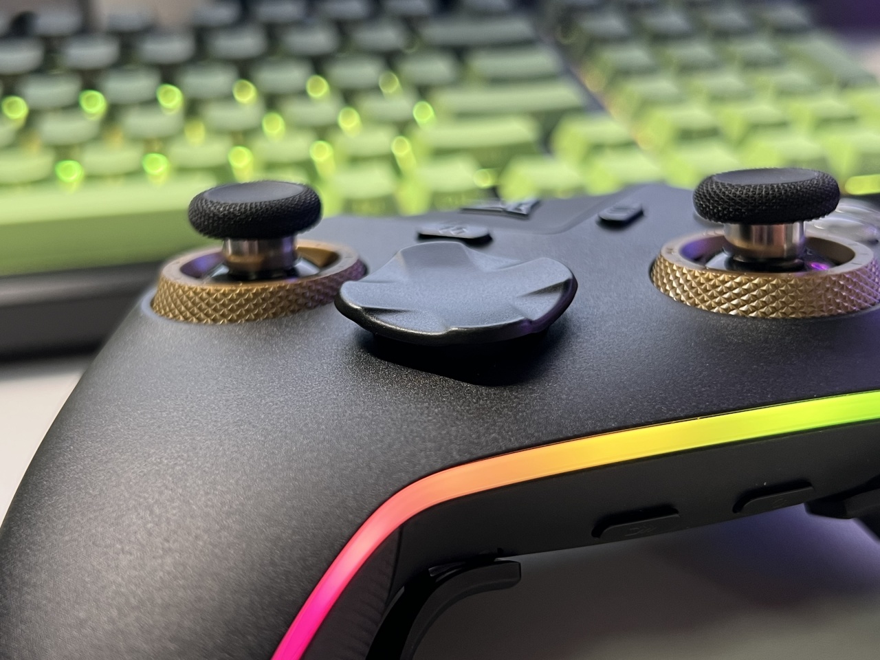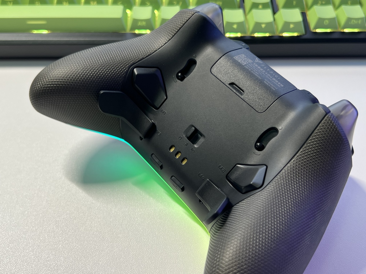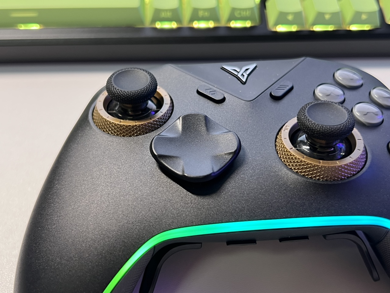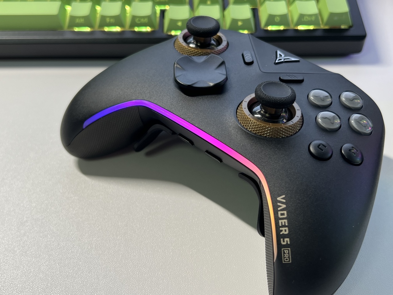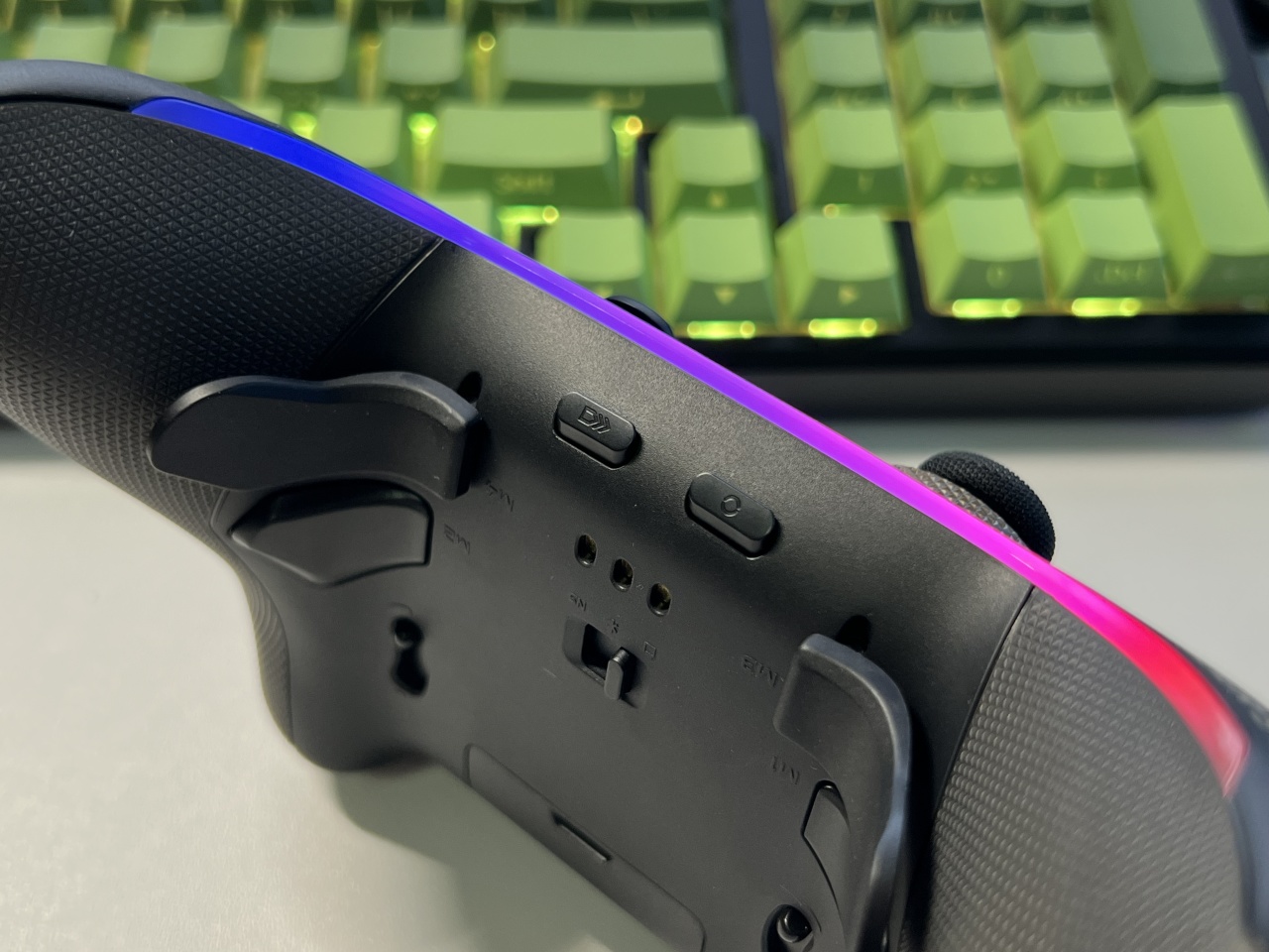 两个握把做了大面积的三角纹TPE防滑包胶,长时间握着汗手不会积汗。面盖和底壳的接缝处做了一条RGB灯条,能用来提示信息以及增加游戏氛围,灯条透光均匀性挺不错。