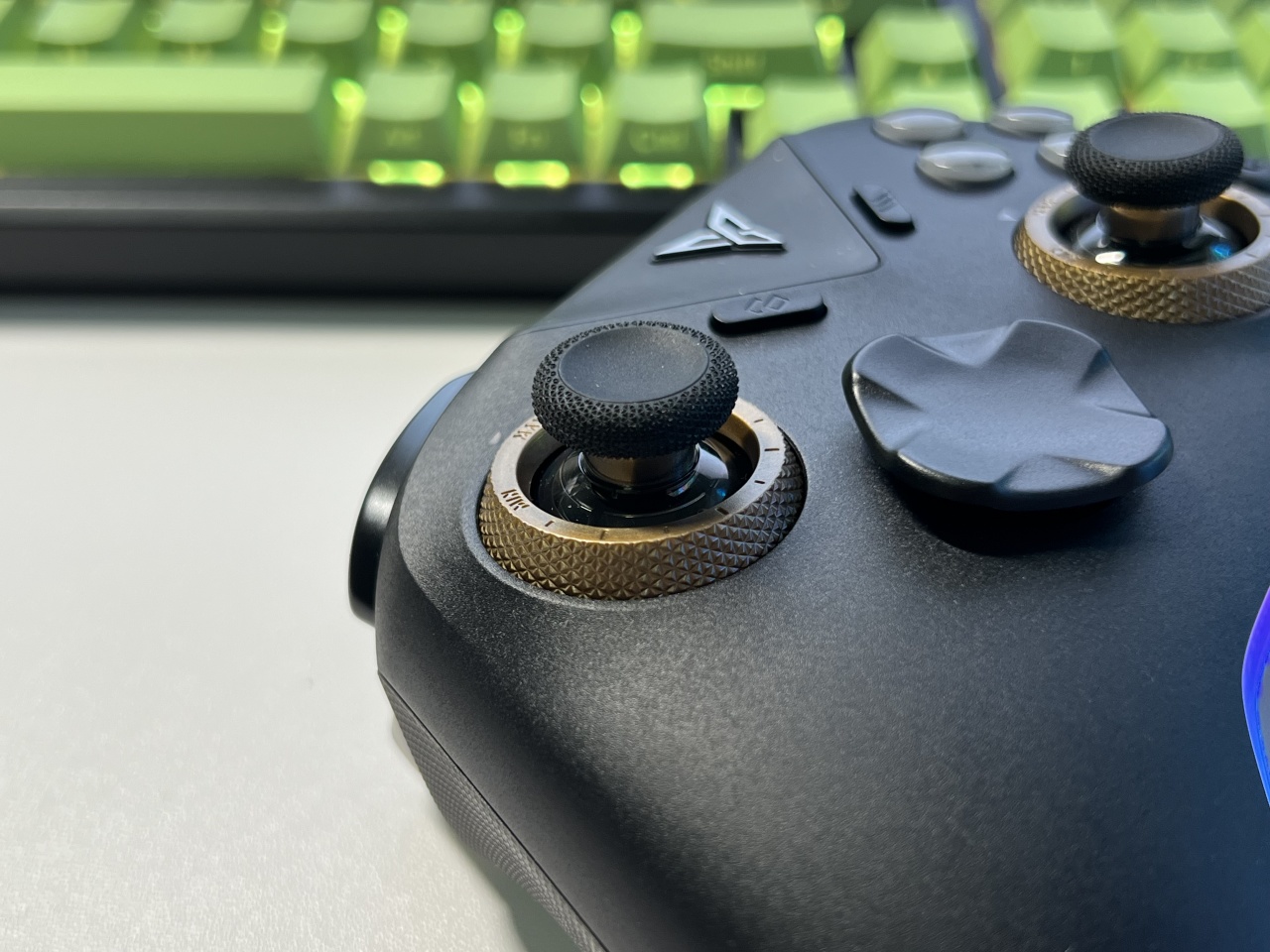 正面按键部分,首先是飞智非常具有代表性的力调节摇杆,前段时间体验的飞智冰原狼4在二百多价位也是用的这款力调节摇杆。