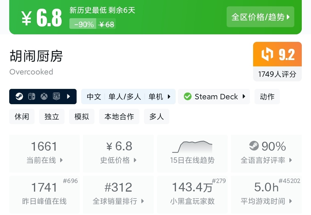 Epic送过。比胡闹厨房更简单,更适合和女朋友一起玩。就算没完成也算通关,不容易吵架