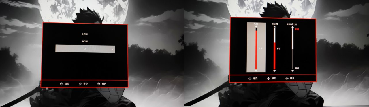上方的图标是选择显示器接口,右边那个是用来调节显示器亮度和对比度的。不过要注意一下,因为X7这台显示器支持HDR的,因此如果你选择开启HDR,那么亮度和对比度就无法调节了