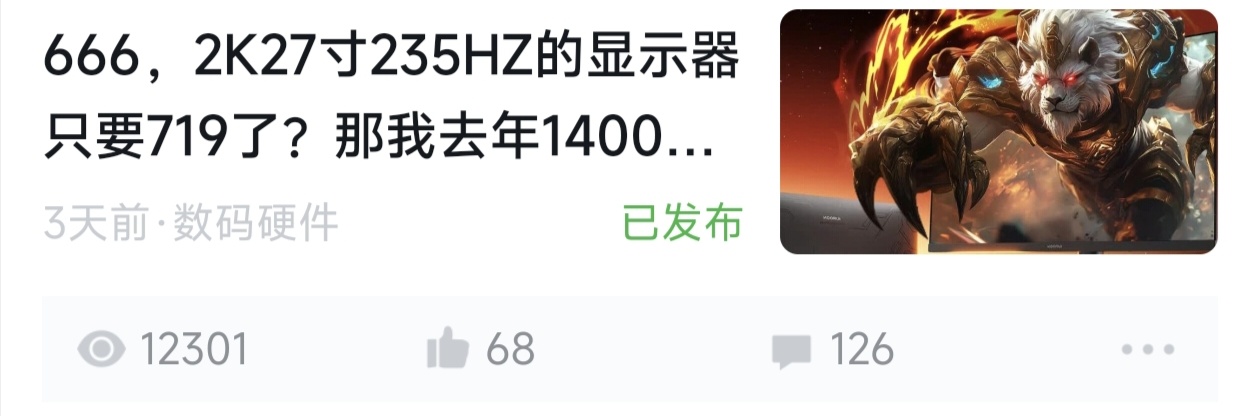 大家好,这里是辣子鱼。前不久不是写了科睿X7的咨询帖吗,一款719就能拿下的2K27寸235HZ显示器,我看了下反响还不错,不少哥们还是挺感兴趣的,毕竟也确实便宜。那么隔了那么久,答应各位的测评来啦
