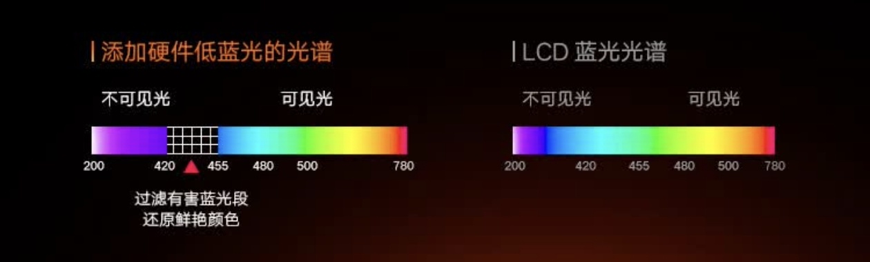 科睿X7就是与硬件低蓝光+无频闪DC调光,可以过滤掉415-455nm有害的蓝光波段。在保证色彩不偏色的同时缓解长久使用的视觉疲劳