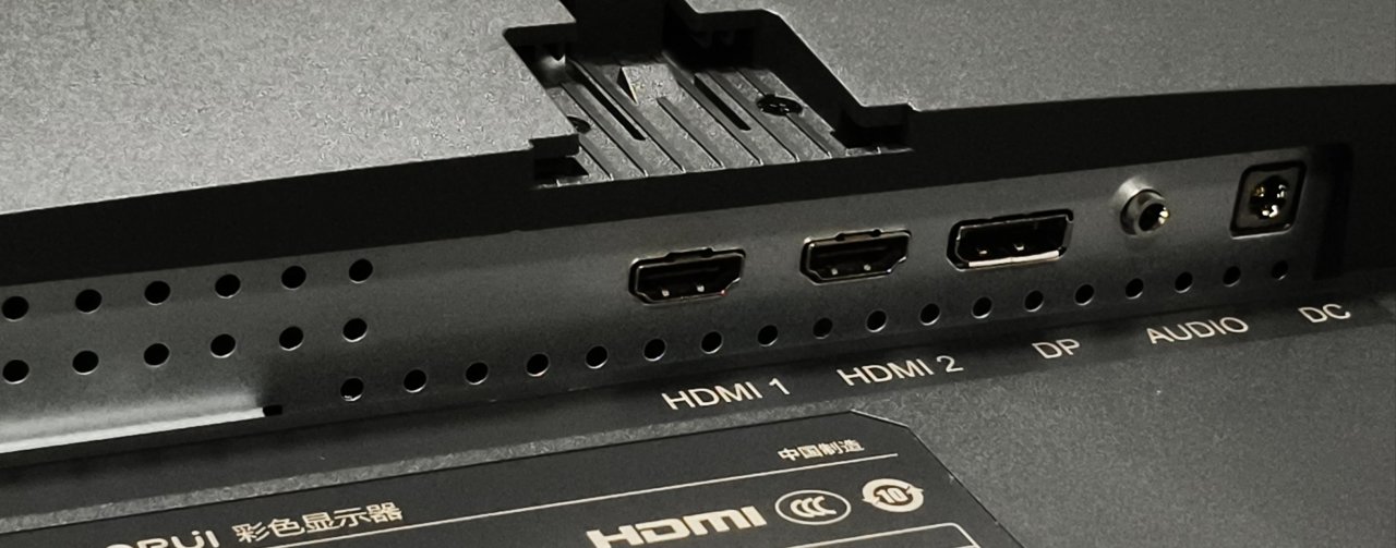 接口方面还挺丰富的,从左到右依次是两个HDMI接口/DP1接口/AUDIO接口以及DC也就是电源借口。除去电脑外,大家也可以连接PS,XBOX这类游戏主机设备进行一个使用