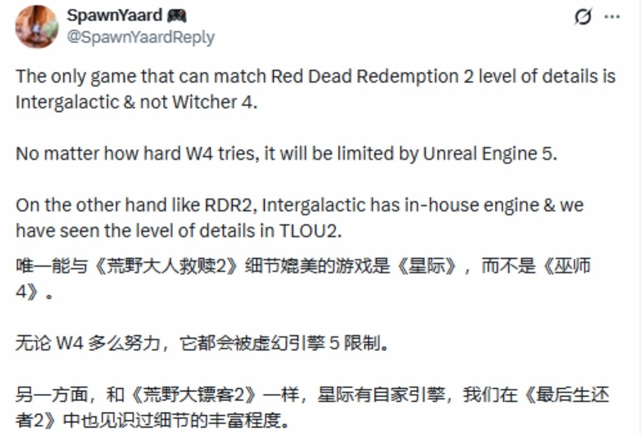 @SpawnYaard分析认为,《巫师4》无论多么努力都将受限于虚幻引擎5的商业框架。而《星际:异端先知》与《大镖客2》一样,基于深度定制的自研引擎开发,这种技术路线更能突破细节呈现的上限。顽皮狗的自研引擎实力在《最后生还者2》中已得到充分验证,其细节表现力令人惊叹。此外,曾参与《GTA》和《荒野大镖客》开发的资深物理程序员迈克尔·埃弗特已加盟顽皮狗团队,这无疑会强化新作的物理表现。这一观点迅速引发玩家群体激烈争论。不少虚幻引擎支持者认为,UE5的潜力尚未被完全挖掘,引擎本身不应成为限制因素。