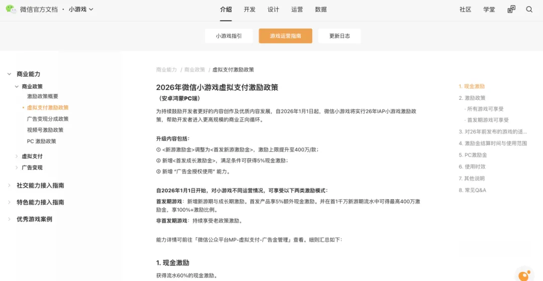 1. 12月30日消息,为持续鼓励开发者进行优质内容创作,微信小游戏宣布将于2026年1月1日起正式升级IAP小游戏激励政策。覆盖范围包括安卓、鸿蒙、PC。此次政策调整后,首发新游将成为重点激励对象。自2026年起,在微信小游戏平台首发的新游将享受“新游期”与“成长期”的双重激励,综合激励比例超过100%,其中单款游戏在首发新游激励金的上限被提升至400万元。对于处于首发期的游戏,近30天内IAP流水每满200万元,平台将额外给予流水5%的现金激励,不设上限。相当于:保持首发,1千万之后的流水,平台和开发者的分成比例从3:7→2:8。来源:竞核,游戏陀螺