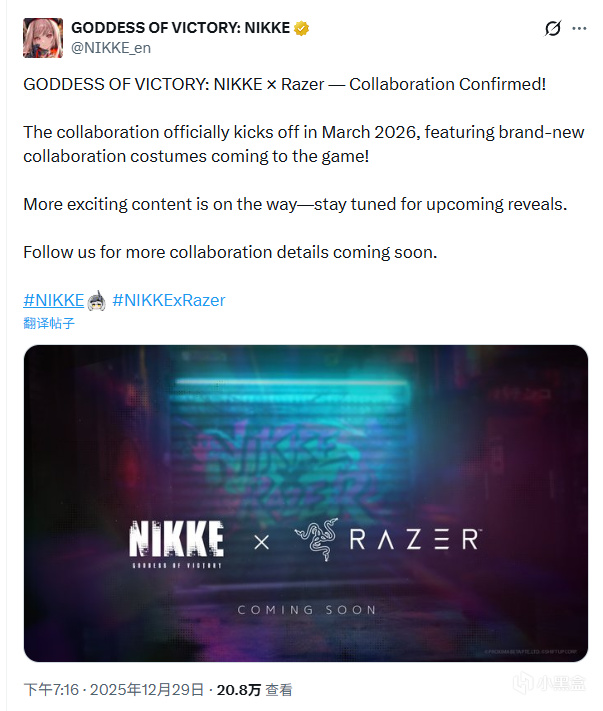 1. 胜利女神:NIKKE × 雷蛇联动将于2026年3月上线。来源:x