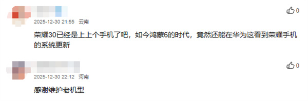 对于此次更新,有不少网友感叹:“6年的机器,还能更新。”“时隔一年零六个月,还有系统维护。”“如今鸿蒙6的时代,竟然还能在华为这看到荣耀手机的系统更新。”