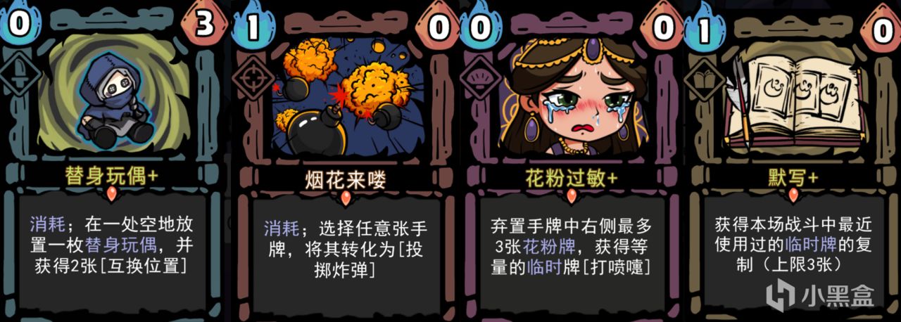 【花粉过敏】(demo尚未公开的新角色):和前两张牌类似,打喷嚏是0费过牌,因此进可攻退可守,combo没来齐就先用来过牌,来齐了就等于3张【肌肉酸痛】,非常灵活。