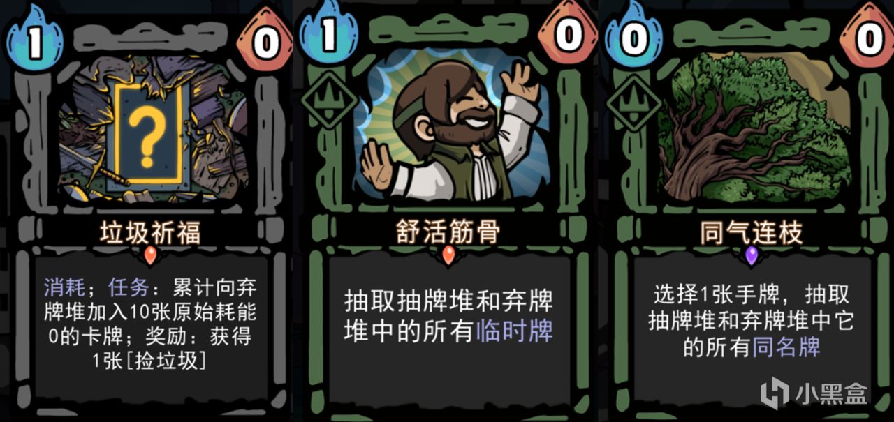 【垃圾祈福】:员工激励包。它的任务是:本局累计向弃牌堆加入10张0费牌。一旦完成,立刻奖励你一张强大的【捡垃圾】(抽取0费卡牌直到手牌数达到10),瞬间可以塞满一把【肌肉酸痛】。