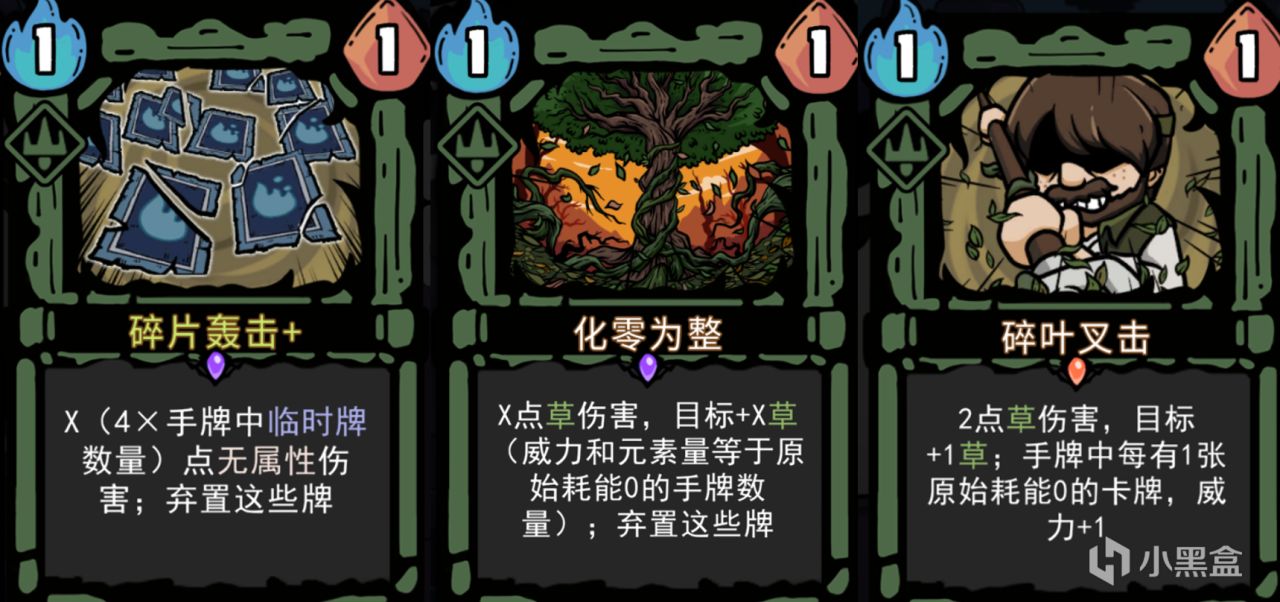【化零为整】:定点拆迁锤。动不动10草伤上10草,配合水元素和火伤害,一套下来伤害也能破百。升级还可以获得保留(弃牌时不用弃),有效提升combo达成率。