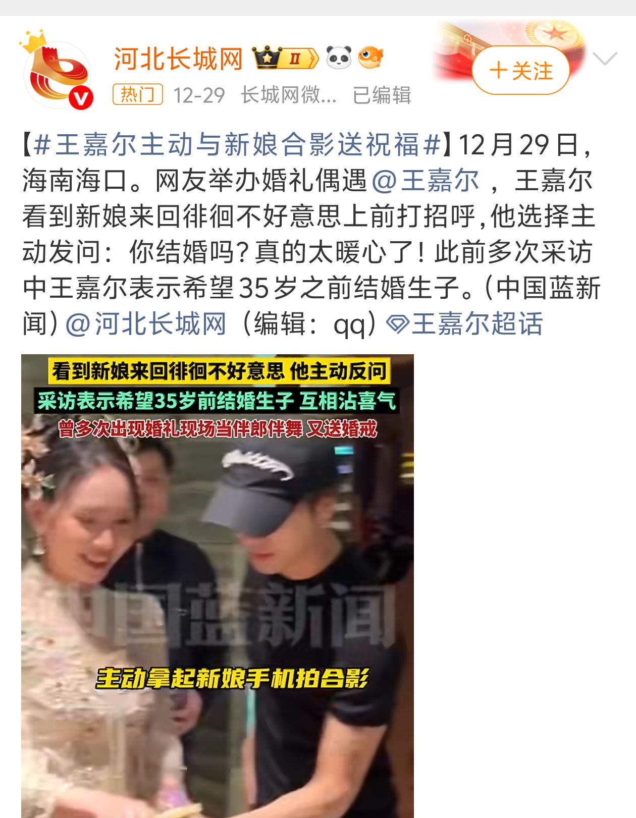 12月29日海南海口,王嘉尔偶遇新娘时主动询问“你结婚吗”,并在得知后立即同意合影,还主动拿起新娘手机拍照,展现亲和力。他在采访中表示希望35岁前结婚生子,认为“对方只要是个人就行,生几个孩子看未来老婆”,并强调“互相沾喜气,幸福加倍”,传递对新人的美好祝愿。助理在现场轻声提醒“正面不要拍好吗”,既维护秩序又保持礼貌,与王嘉尔的亲民形象一致。