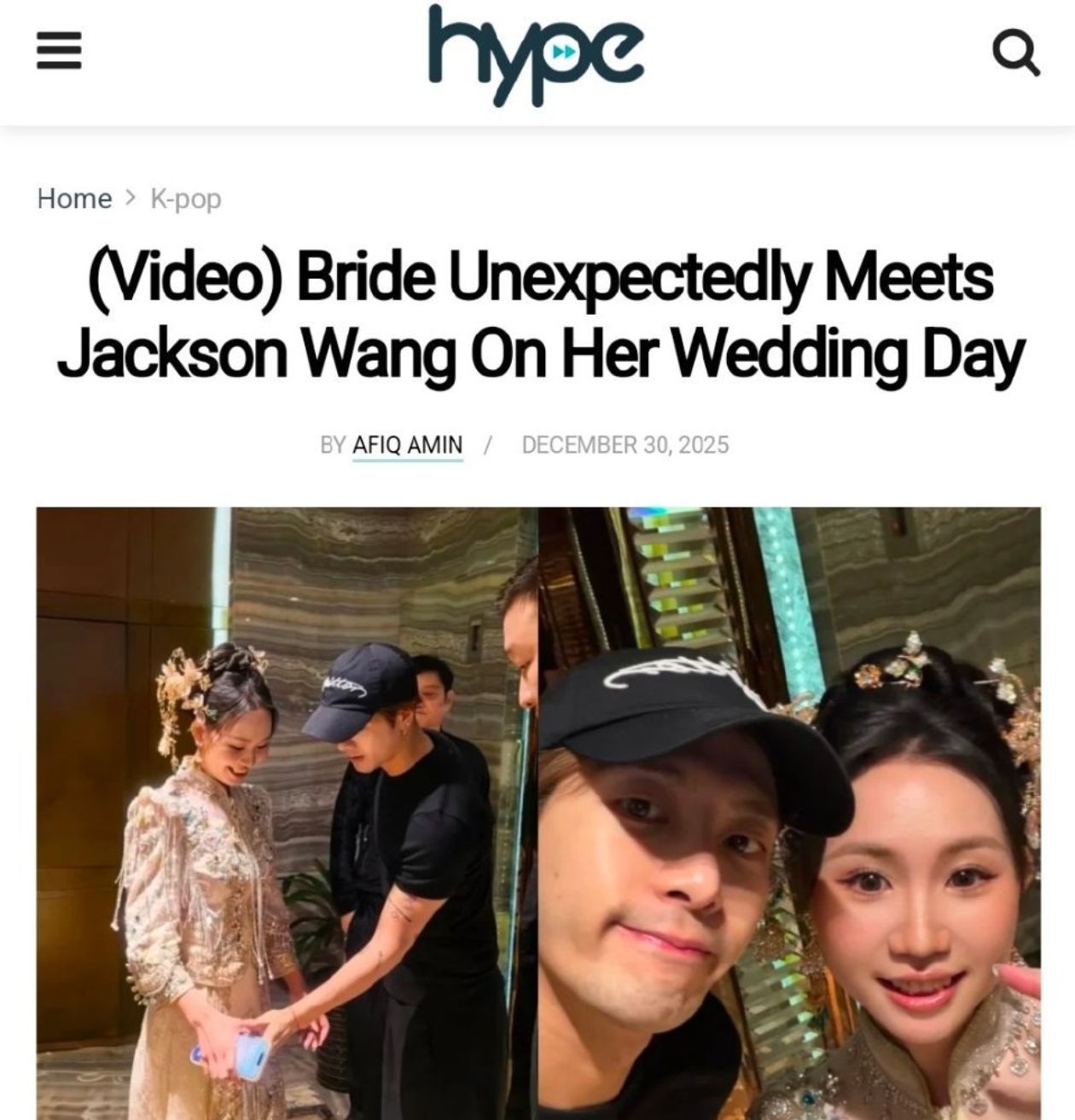 据报道,12月29日星期一,一场婚礼在一家未公开的酒店举行,新娘和伴娘们在前往电梯的路上意外偶遇王嘉尔及其团队。新娘认出这位歌手后,礼貌地询问是否可以与他合影。王嘉尔欣然同意,摆好姿势拍照,并祝贺新娘新婚,祝她婚姻幸福美满。