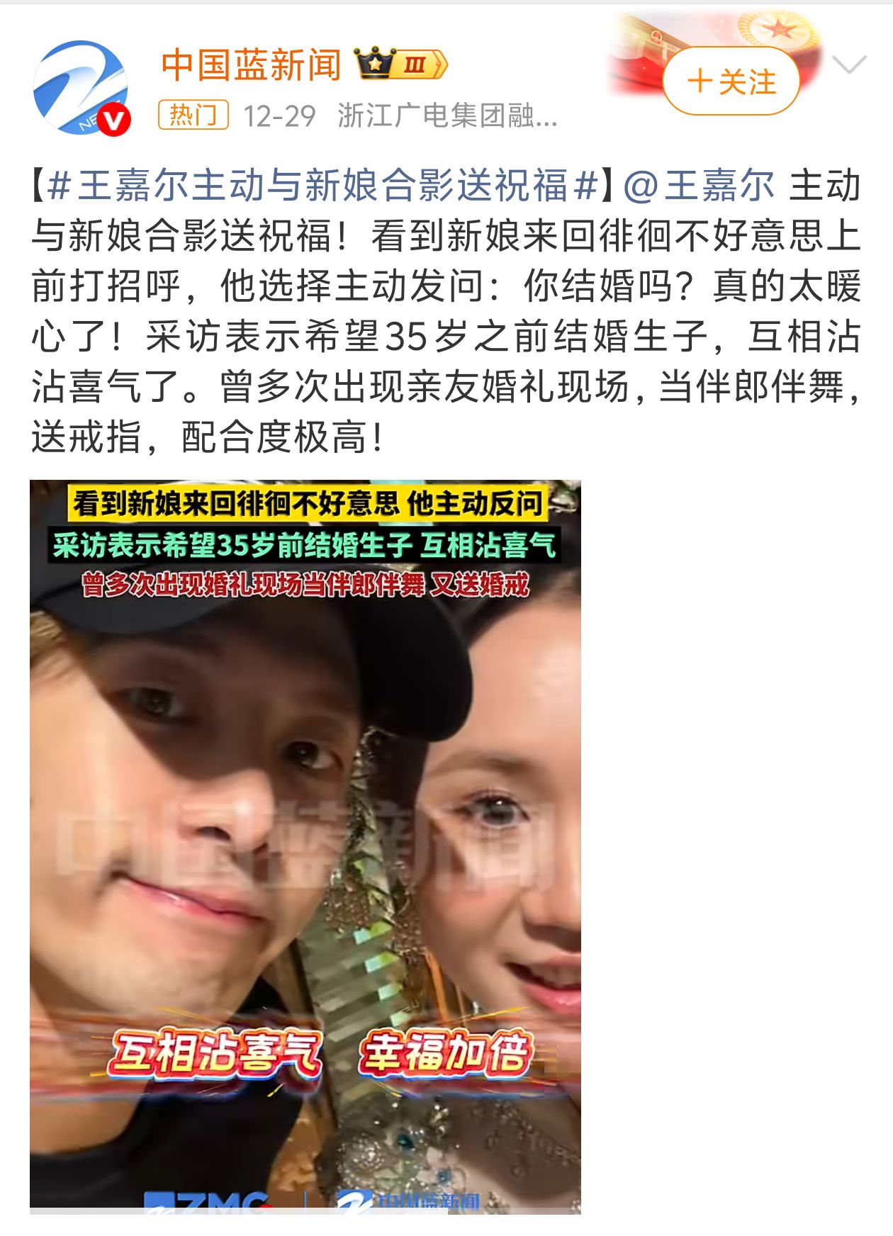 嘉尔主动与新娘合影送祝福!看到新娘来回徘徊不好意思上前打招呼,他选择主动发问:你结婚吗?真的太暖心了!采访表示希望35岁之前结婚生子,互相沾沾喜气了。曾多次出现亲友婚礼现场,当伴郎伴舞,送戒指,配合度极高