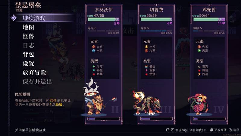 游戏的像素美术完成度也很高,“怪兽”设计非常经典,既符合动物性的生理构造,又可以通过奇幻生物的形象设计直推怪兽在游戏中的功能定位,同时像素live2d的关键帧也k得极佳,在美术上投入的资源非常优渥。