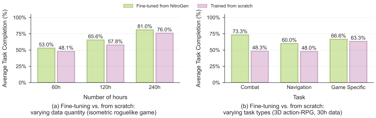 原文图7:在新游戏上微调 NitroGen 能显著提升任务成功率,尤其是在战斗和导航任务上。(a)当改变数据量时,任务完成率会随着数据集大小而变化,微调平均能使任务完成率相对提高 10%。(b)在低数据量情况下(30 小时)改变任务类型时,微调能使任务完成率相对提高高达 52%。