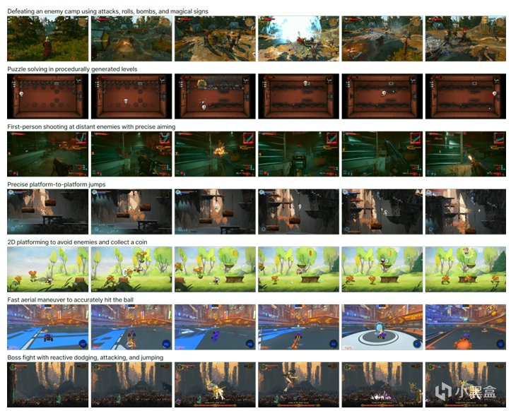 原文图4:In-game rollouts。NitroGen在各种2D和3D环境中执行任务的情况。这些任务的执行时间从几秒钟到几分钟不等。其中一些任务涉及记忆,而另一些则在程序生成的世界中进行,需要模型具备适应能力。