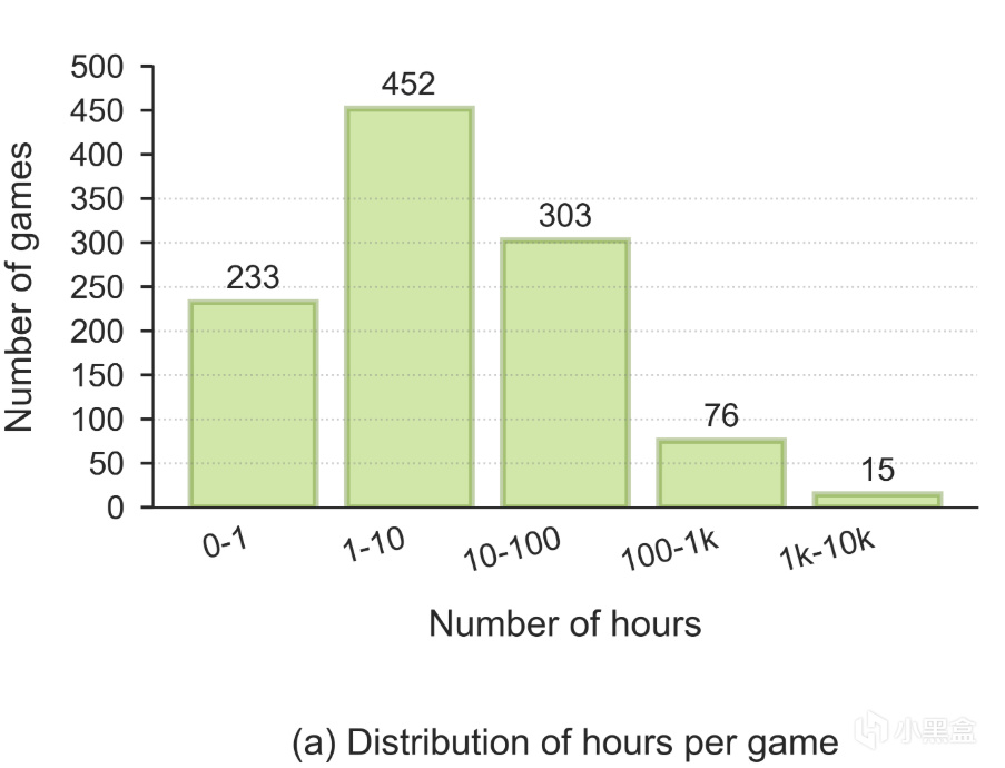 原文图3:每场游戏的时长覆盖范围广泛,有 846 款游戏的时长数据超过 1 小时,91 款游戏超过 100 小时,15 款游戏每款的时长都超过 1000 小时。