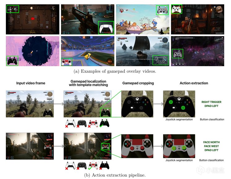 他们收集了 7.1 万小时带手柄覆盖层的游戏视频,然后用计算机视觉技术定位、裁剪出手柄区域,再用一个训练好的分割模型识别摇杆位置和按键状态。最终,他们构建了一个包含4万小时视频、覆盖 1000 多款游戏的数据集。