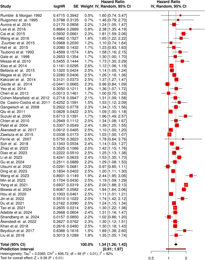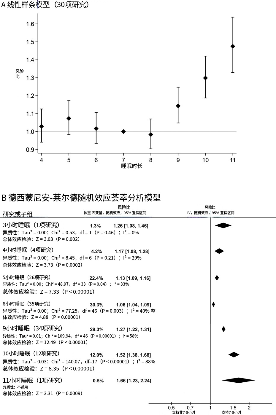睡眠时间过长与死亡率。森林图展示了基于 49 项研究得出的睡眠时间过长与死亡率之间关联的风险比。采用逆方差法应用随机效应模型 , 结果显示睡眠时间过长者的死亡风险显著增加 34%。