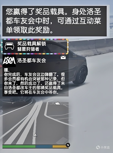 5.競速獲勝後會收到領獎消息,需前往洛聖都車友會內部,M互動菜單-洛聖都車友會-獎品載具挑戰-領取獎勵。(領取後永久解鎖聖誕樹迷彩塗裝)