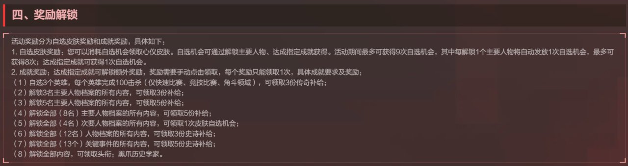 8個主要人物,每天登陸活動解鎖一個主要人物,每次獲得一次自選皮膚機會