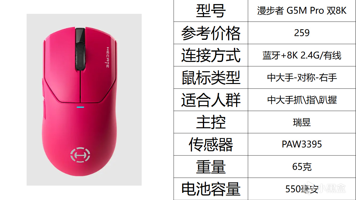 这款跟G304的尺寸基本一样,唯一区别就是比G304宽面宽0.75毫米,但多了无线和蓝牙的连接方式,而且也有800毫安。完全可以当做G102和G304的替代品。重量也只用59克,比G102,G304轻很多。而且也是采用了欧姆龙的一亿次按压寿命的机械微动,而且也加上了国产鼠标少有的预压系统,但缺点也很明显,他的预压解构用久会晃,解决方案就是撬开上盖,加两泡棉能稍微解决一下。他也有3395的版本,但个人不是很推荐,得上一个更好的主控才好推荐,一个是低DPI需要更高的回报率才更好画圆不偏移。另外一个是主控性能也限制是传感器的性能释放。