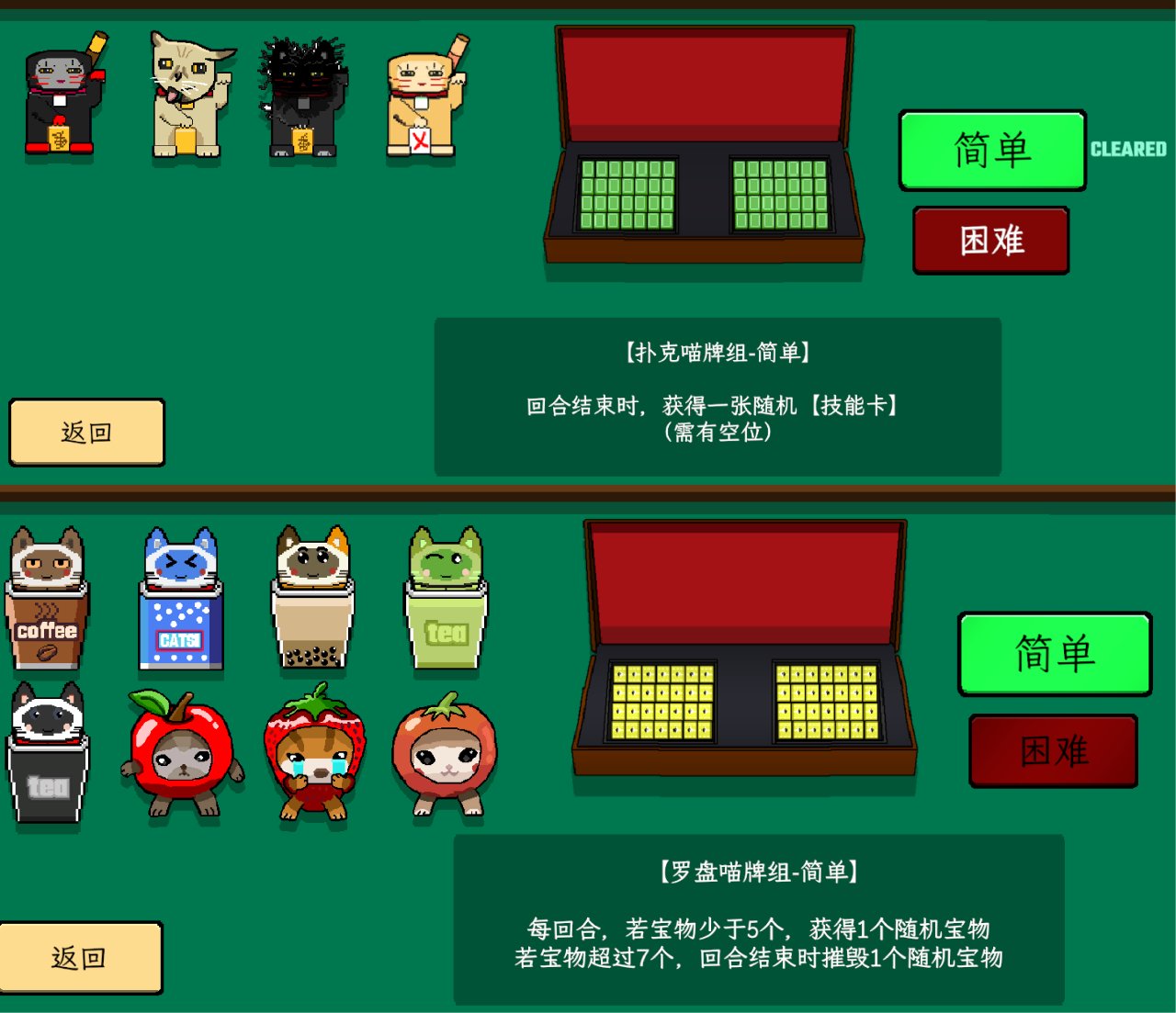 Demo开放了扑克喵和罗盘喵两个牌组、简单和困难两种难度。新手推荐先玩扑克喵,每回合随机送技能卡(换牌)。罗盘喵在前期赠送随机宝物喵,中后期的负面buff偏大。每局游戏共16关,通关后解锁新宝物。