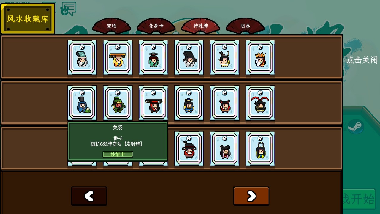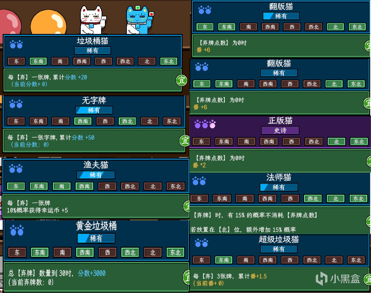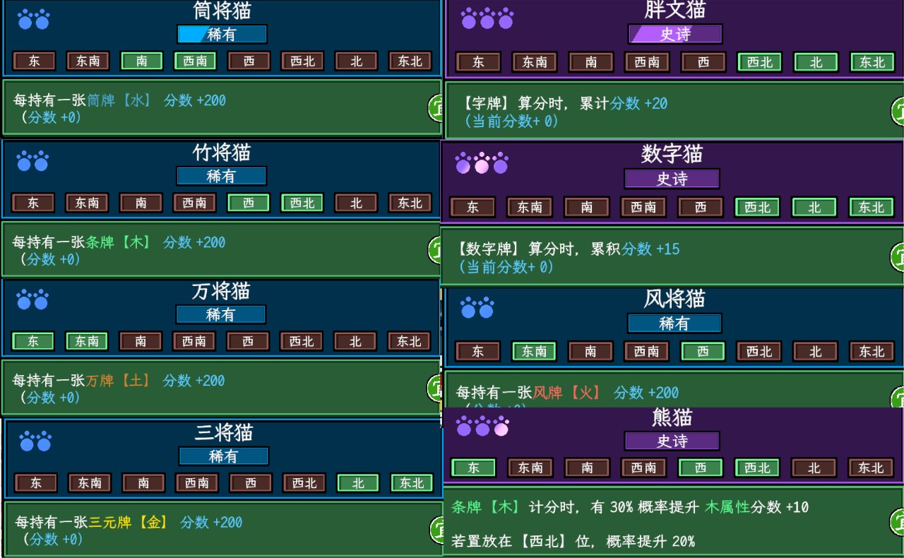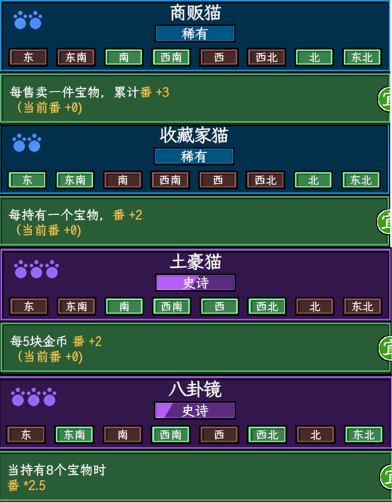 名为“风水喵将”,不仅有猫猫,还有风水等中国文化元素。8个宝物槽,对应着东南西北八个方位。每个宝物有适用方位,放在其他方位会带来禁用Debuff。把历史名人做进了化身牌,铁扇公主能手牌变成风牌,屈原能够增加水属性牌面分数。