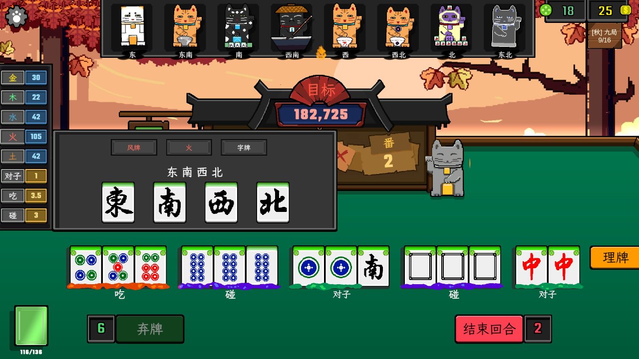 弃牌流:每回合弃牌数用完时,番+6,番×2,分数+3000(弃牌数达到30),累计分数+20(每弃一张牌),累计番=1.5(每弃3张牌)。弃牌流的核心在于多弃牌,在前期可以满通关,多过回合多弃牌。