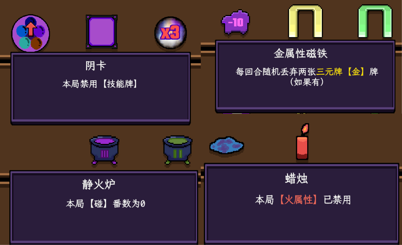 每回合,玩家会受到阴器的影响。阴卡禁用所有技能牌,磁铁随机丢弃两张某属性牌,静火炉让碰番数归零,蜡烛禁用某属性牌(类缺一色,该属性无分数)。