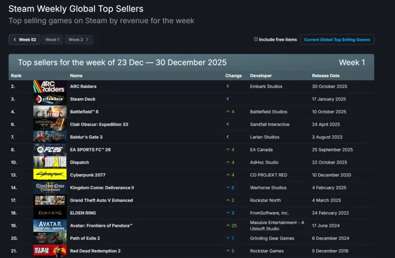 Steam 2025年最新一周游戏销量排行榜出炉(2025年12月23日-2025年12月30日,无免费游戏),年度黑马《ARC Raiders》成功坚持到了最后,力压TGA年度游戏《光与影:33号远征队》和《战地6》,除此之外,或许因为冬促的原因,诸多大作重回榜单,如《博德之门3》和《艾尔登法环》等等。值得注意的是,此前回归榜单的《怪物猎人:荒野》再次不见了踪影,让我们一起来看看具体前十名有哪些大作吧!