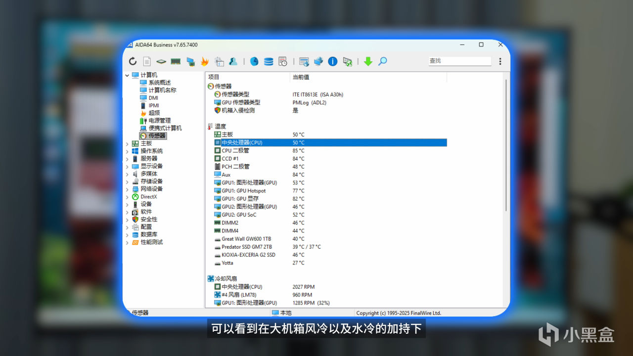 可以看到在大机箱风冷以及水冷的加持下,不管是CPU还是显卡的温度表现都很不错,真的建议大家有条件还是上水冷跟大机箱