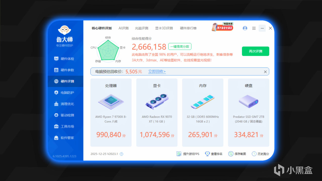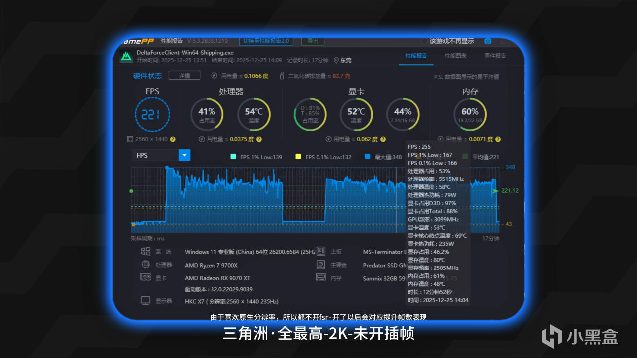 可以看到9070xt加9700x的组合性价比确实非常高,基本上市面上的游戏很少能遇到搞不定的了,如果选择极致的刀刃机而不是像我这种的刀把机,性价比会更高,