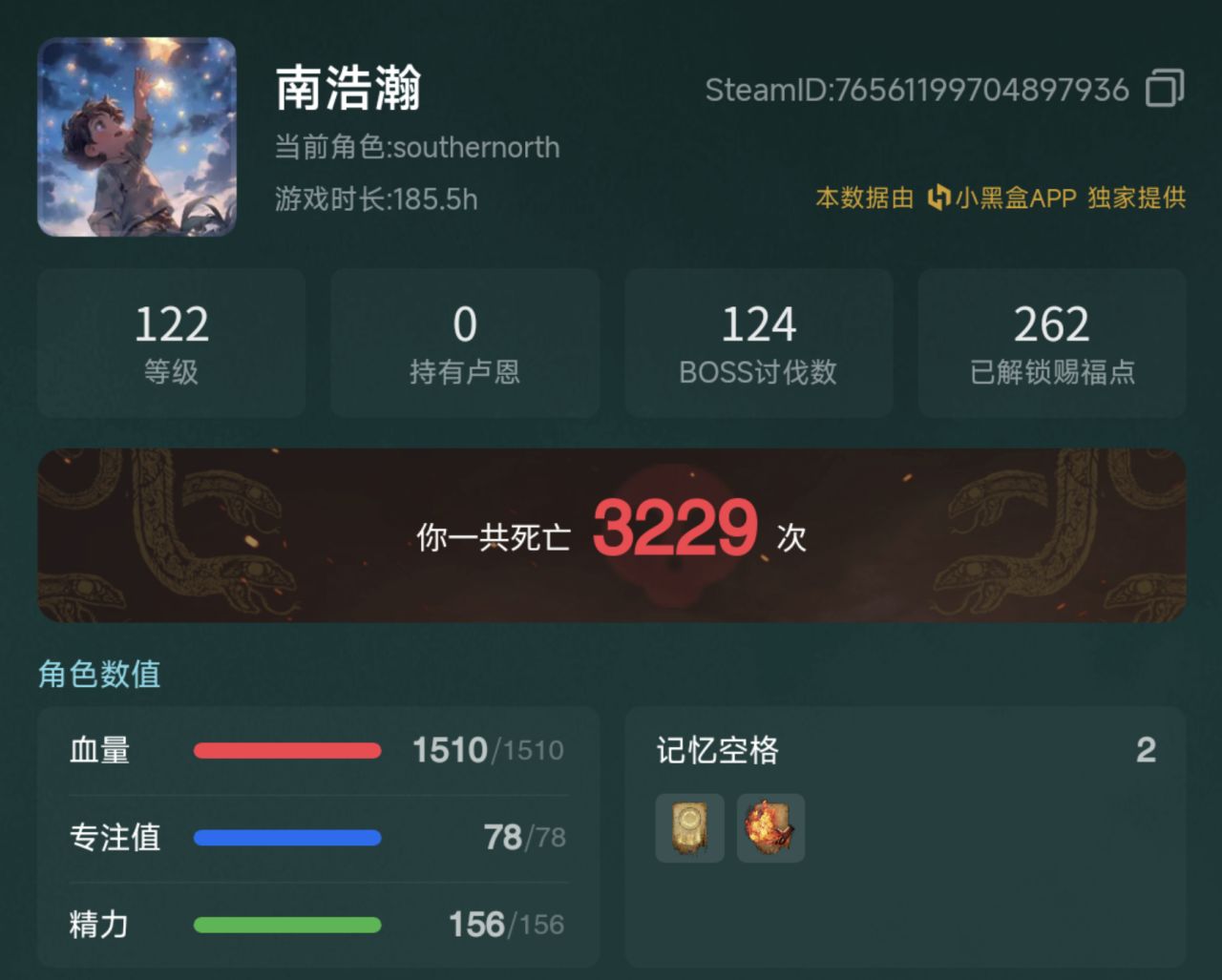 我死了3000次,杯赐福了265次,君王军直剑挥了200h,讨伐了130个BOSS,升了122级,当了一次王……从没有任何一个游戏给我如此的史诗感,从没有人给我成王有如此的厚望,我从没有那么顽固偏执,我可以再死3000次,只为了那1次王。
