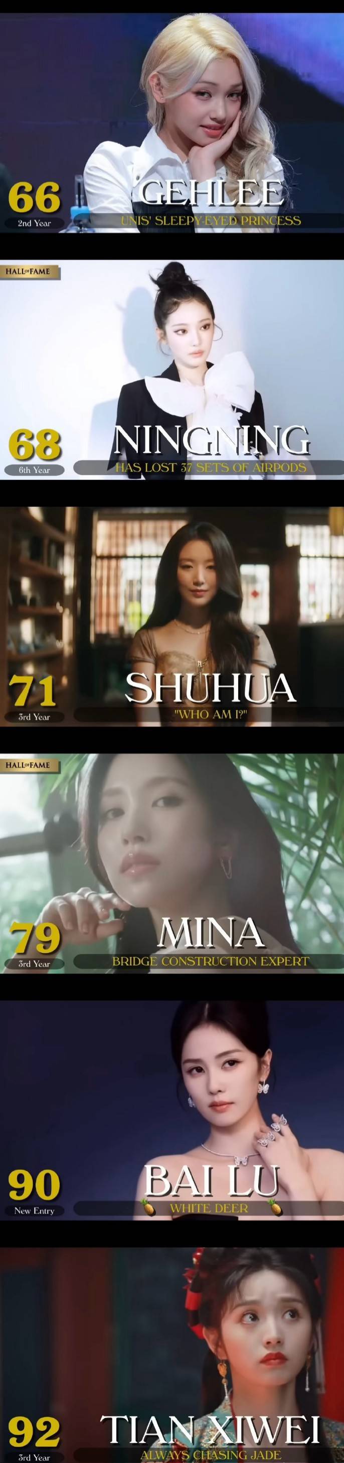 中国内地女演员白鹿首次入选,排名第90位;田曦薇位列第92位,这是她继2023、2024年之后第三次上榜。韩国(G)I-DLE成员宋雨琦也成功入选,排名第59位。