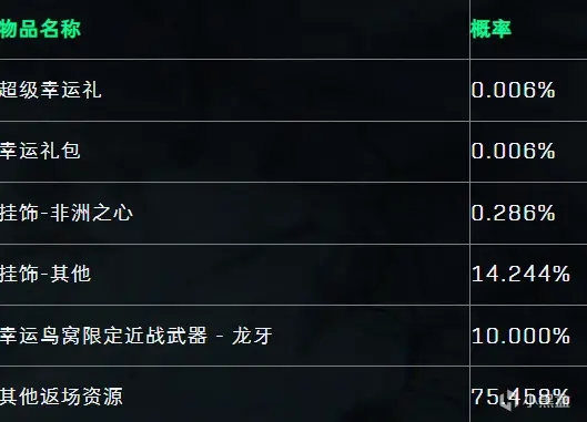 还有这个“非洲之心”挂饰,概率0.286%,大约是千分之三!我个人对挂饰无感,所以概率这么低也是我没想到的。