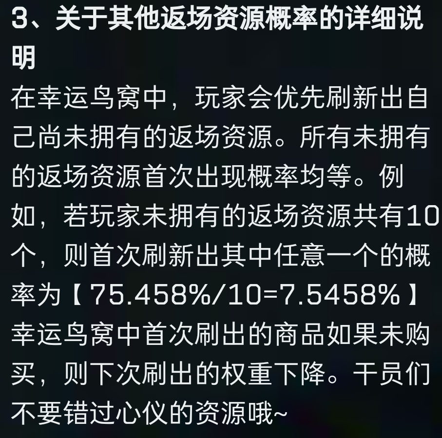 而其他返场资源概率也是有计算方式的,这个倒没啥好说的,不过刷新出来结果跳过没买,那再刷出来的概率会降低,所以确实喜欢的话也可以理性购买一下。