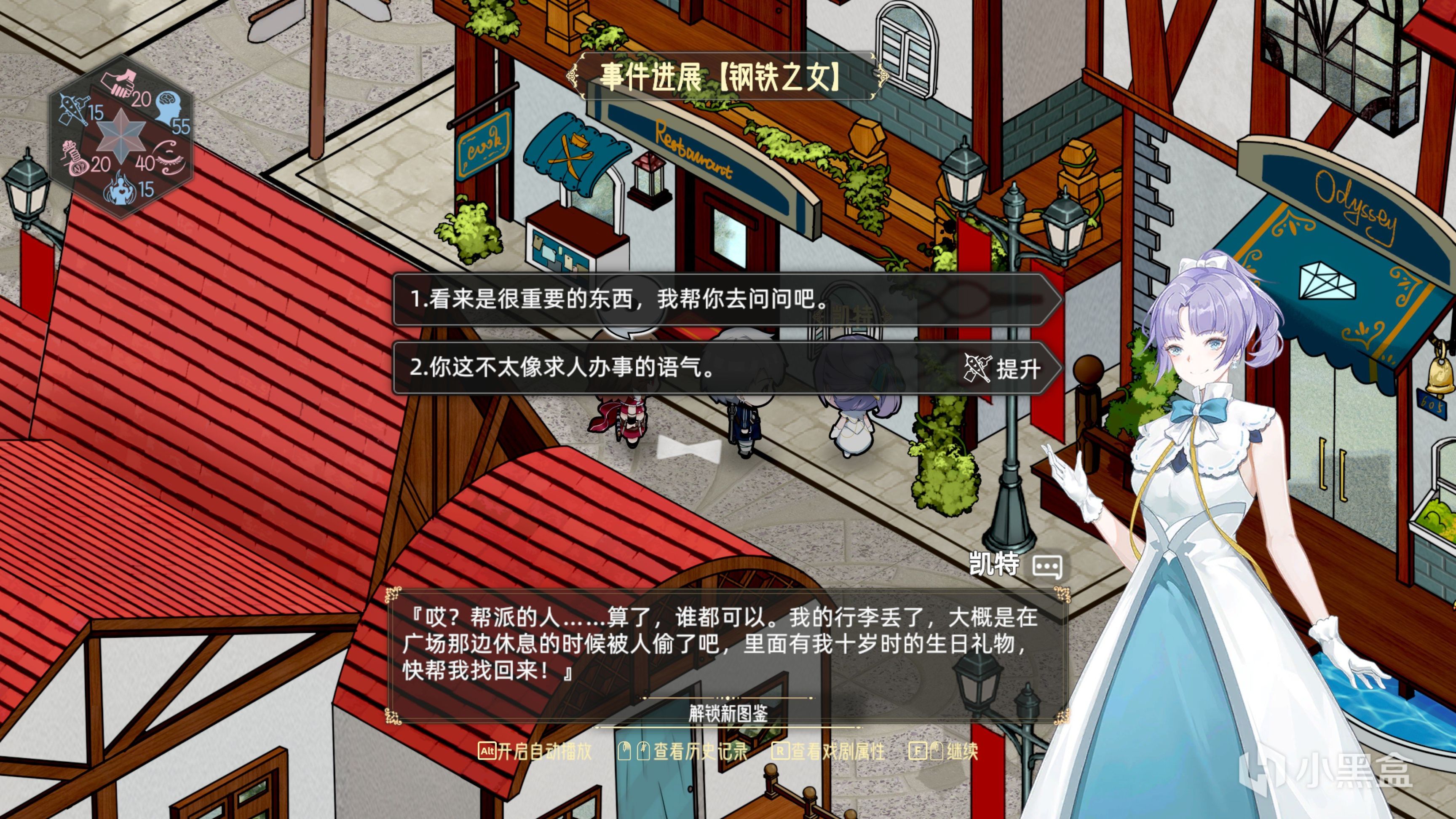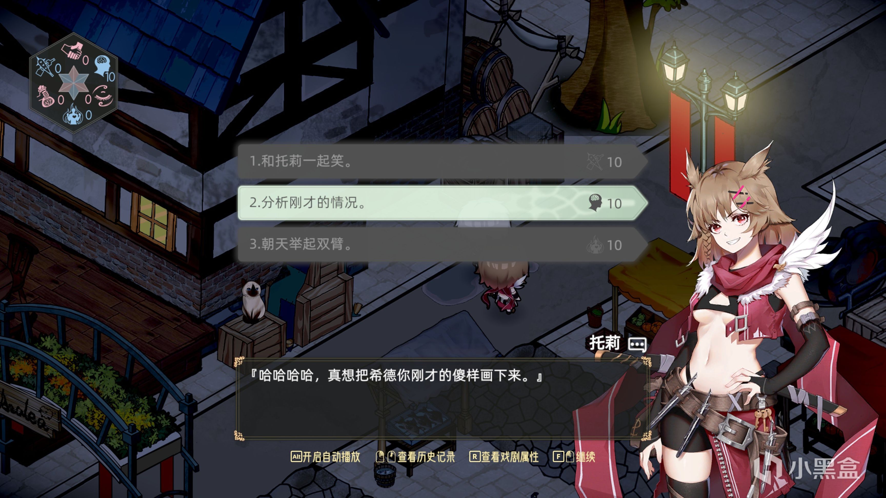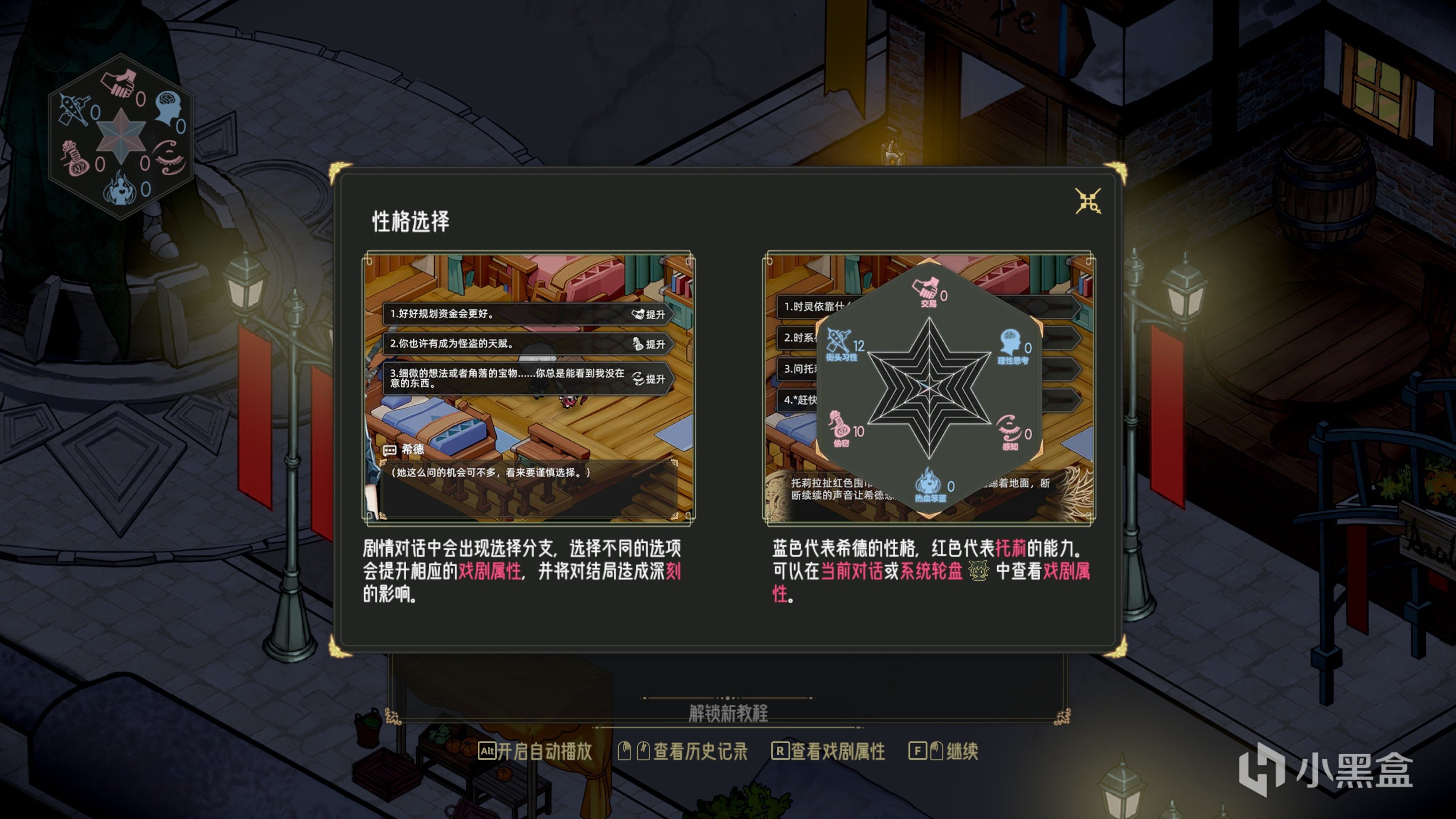 上文我們提到主角性格,遊戲在這裏提供了一個叫——戲劇屬性的系統,在玩家做任務或者與NPC對話過程中有一些選項,這些選項可以提升戲劇屬性,是扮演熱血笨蛋、還是黑幫大哥、或者是依靠頭腦來思考問題的人物,都取決於玩家的選擇,並且還會對結局造成影響。遊戲中藍色的爲希德的性格,而紅色的是託莉的性格,讓我們的時靈夥伴託莉是專注於感知還是偷竊、再或是交易砍價,這些發展路線也還是取決於任務和對話中的選項。