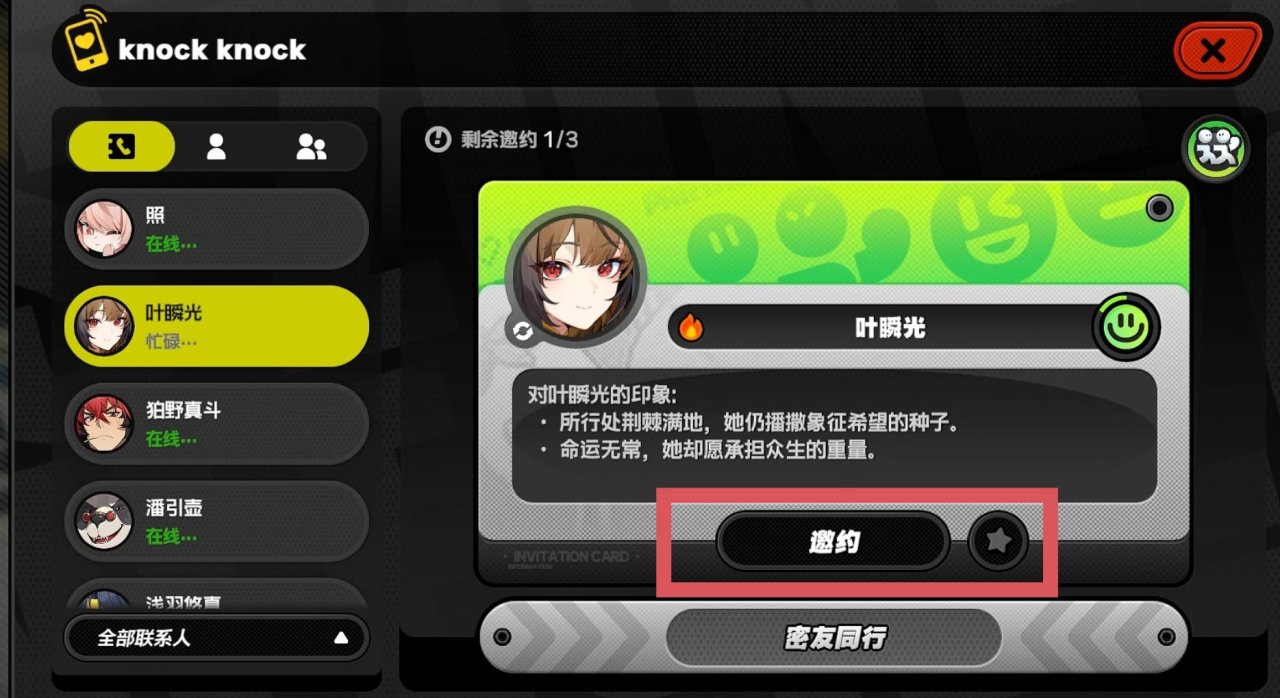 打开手机,选择最左边的通讯录,在线的角色基本都可以邀约,完成邀约后角色会显示忙碌当天不可再邀约。